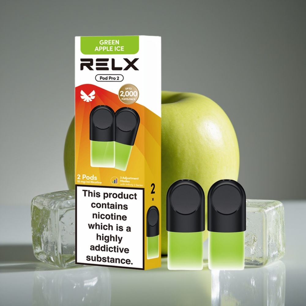RELX Pod Pro 2 – Groene Appel IJs – 1,8% Nicotine – 600 Puffs – 1,9ml – 2/3 Pods per Verpakking – 3 Voltage Modes (Eco 5,5W, Smooth 6,5W, Boost 8W)