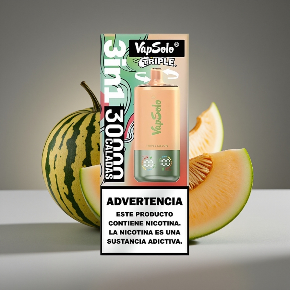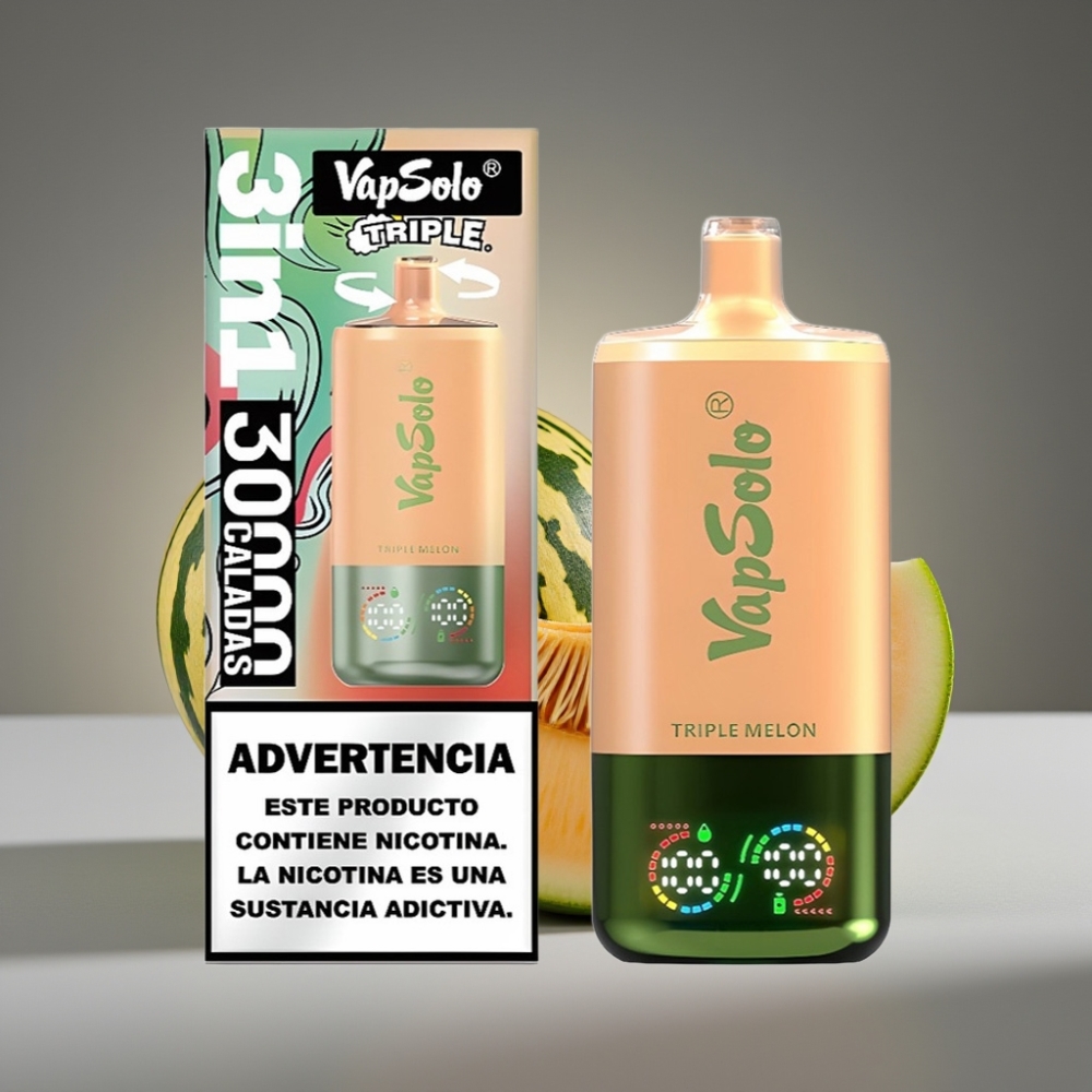 VapSolo Triple 30000 Puffs Disposable Vape Triple Melon – 40ml E-Liquid, 20mg/ml & 50mg/ml Nicotine, 3 Oil Tanks, Type-C Charging